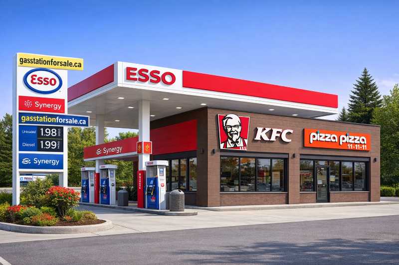 Exceptional opportunity to acquire a well-established Esso gas station with strong food anchor tenants, featuring KFC (with drive-thru) and a Pizza Pizza operation, both independently operated and providing additional income streams.